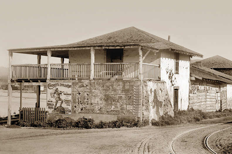 Despite the Lamberts’ best efforts, Custom House fell into decline—mirroring the overall condition of the forlorn pueblo of Monterey. In 1879, Robert Louis Stevenson lived for several months in Monterey. In “The Old Pacific Capital,” he describes Monterey as “…a place of two or three streets, economically paved with seasand, and two or three lanes, which were water courses in the rainy season… Short sections of wooden sidewalk only added to the dangers of the night…”
