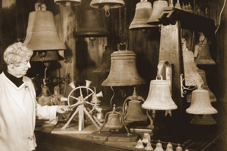 Today, The California Bell Company is based in Saratoga and is owned by real estate broker John Kolstad. “I wanted to purchase a bell for my home and tracked down the company’s owner, Joe Rice.” Rice acquired the business in 1955, closing up shop in the early 1960s. “Joe told me he wouldn’t sell me one bell, but he would sell me the company, and I bought it in October 2000.” The sale included molds, equipment, vintage photo and several original bells. Kolstad found he had enough to continue making new bells, and that led to a contract with Caltrans to produce replacement bells. “They are delivered bright and shiny and quickly attain the patina we’re all used to seeing.” California Bell Company produces a range of bells, including replicas of the Mission Bells for sale to private individuals. The firm also forged the bell that hangs from the World War I memorial arch in the median of Ocean Avenue at the corner of San Carlos Street. More historical information on the company is online at www.californiabell.com.